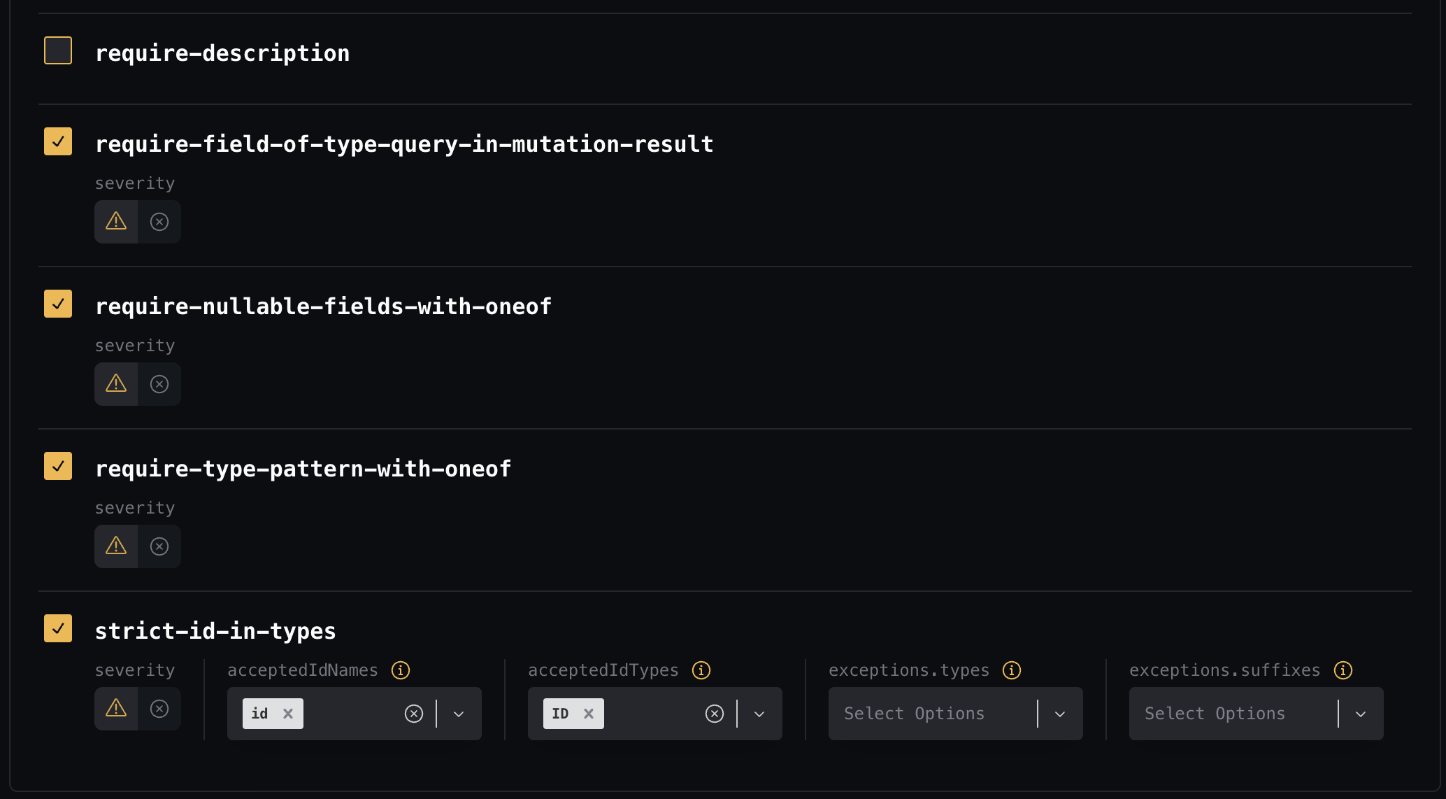 Every rule activated in the policy can be configured with the corresponding options. Some rules might only have the severity option, but some rule can be configured with additional options to ensure flexibility.